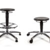 This PU stool is available as a high stool with a foot support ring and glides, or as a low stool with a choice of brake loaded, break unloaded or soft tyre castors.